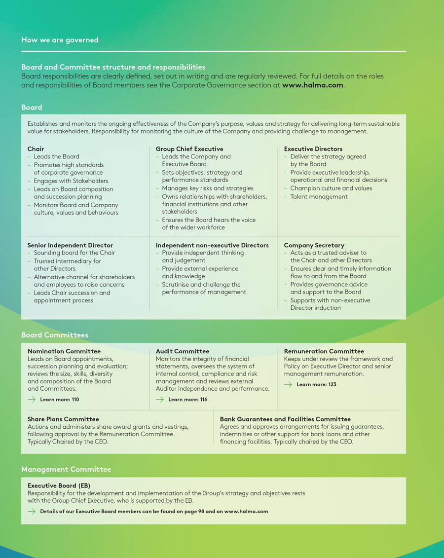 The Board has established three principal Committees – Audit Committee, Nomination Committee, Remuneration Committee – which review and monitor key areas on behalf of the Board and make recommendations for its approval. Each Board Committee operates under written terms of reference which are approved by the Board and made available at www.halma.com. The Chair of each Committee reports to the Board on their activities after each meeting and minutes are circulated to all Board members once they have been approved by the Committee. Further information on the activities and composition of each Committee is detailed in each of the Committee reports.